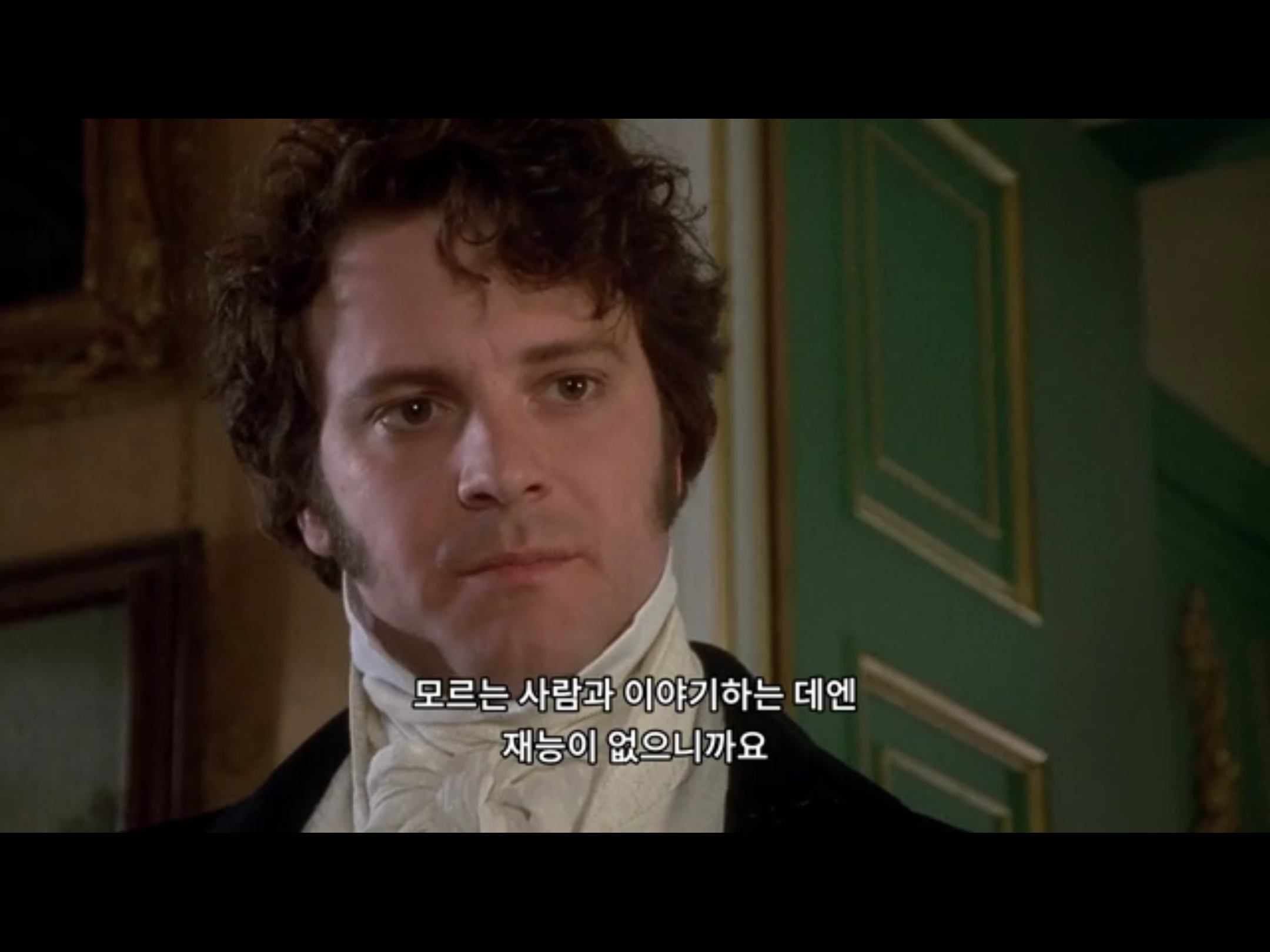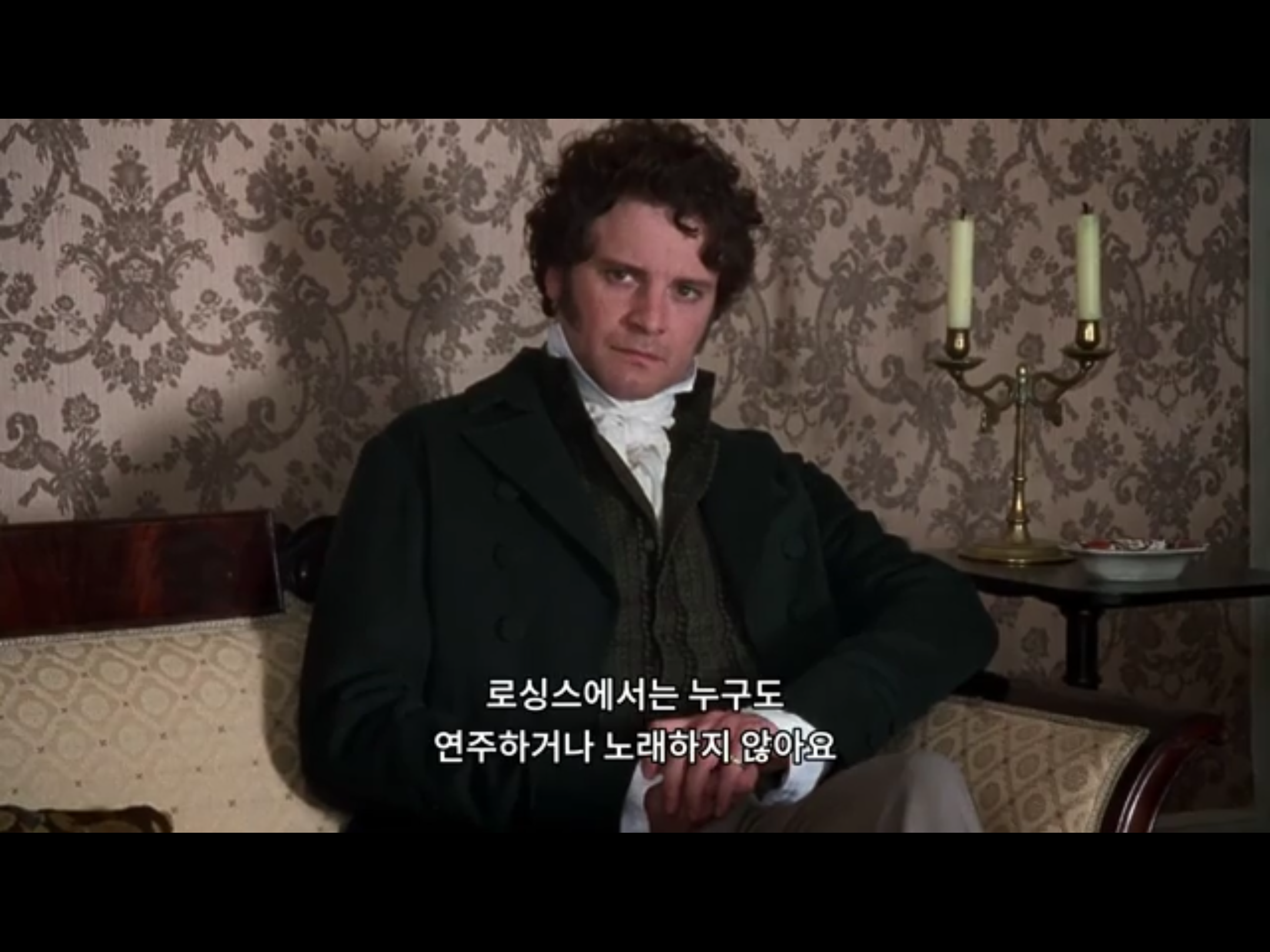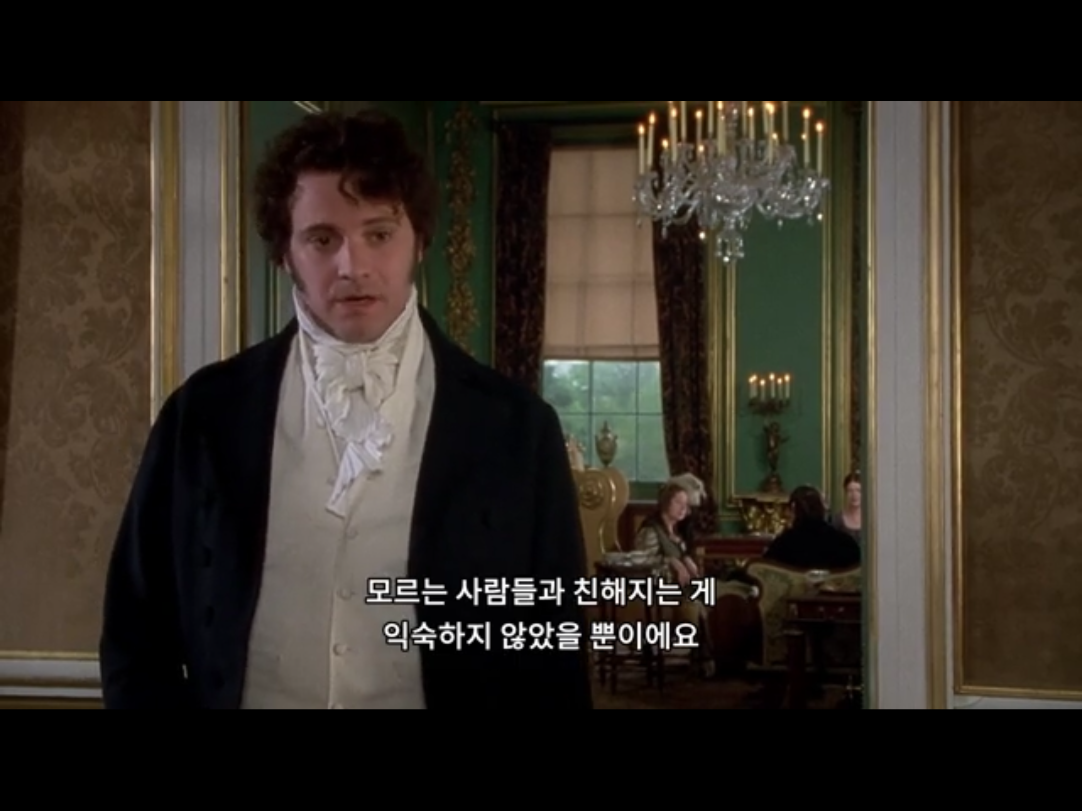 자신의 단점을 인정하고 담담하게 이야기하는 다아시. 다아시의 단점을 웃으면서 이야기하며 가슴에 비수를 꽂는 리지. 이때도 다아시의 표정은 리지가 사랑스러워 죽겠다는 듯 푹~ 빠진듯한 눈빛입니다.